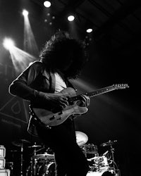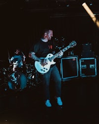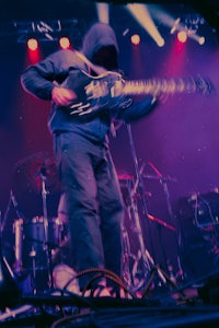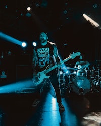 While it’s hard to miss Wells’ towering stature from the crowd, it’s harder to miss Eidola’s lead guitarist, Sergio Medina, whose high-energy stage presence is unparalleled in the progressive metal/swancore scene. Throughout Eidola’s set, Medina can often be seen leaping and darting across the stage while ripping guitar riffs, in a manner both erratic and captivating to showgoers.